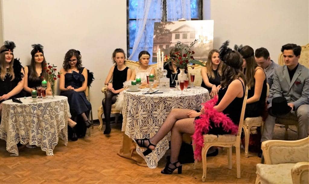 Wnętrze pałacu zmieniło się w kawiarnię z okresu międzywojennego, pełną klimatycznych gadżetów – strojów, kwiatów, świec, kapeluszy. Kostiumy wykonawców także nawiązywały do epoki – piękne suknie, boa z piór, kapelusze, biżuteria. Młodzież wyglądała cudownie, a zaprezentowane przez nich piosenki i wiersze jeszcze podkreśliły ten klimat. Usłyszeliśmy „Miłość ci wszystko wybaczy”, „Nie kochać w taką noc to grzech”, „Ostatnią niedzielę”, „Sex appeal” i wiele innych przebojów przeplatanych tańcami i wierszami z epoki. Licznie zgromadzona publiczność żywiołowo reagowała na program – były oklaski, wspólne śpiewanie, a nawet tańce. Czuć było radość ze spotkania, potrzebę wspólnej, spontanicznej zabawy, nostalgię. Szczególnie bisy, podczas których rozdano widzom mini śpiewniki z tekstem czterech piosenek, połączyły wszystkich – młodzi artyści wmieszali się w publiczność, porywali do tańca, atmosfera zrobiła się wspaniała. Występ nagrodzono owacją na stojąco. Program przygotowały nauczycielki z SP Kąty – Sylwia Kotlarska, Maja Ryż i Ewa Osińska, a wystąpili: Anna Modzelewska, Agata Dalicka, Patrycja Rogowska, Wojciech Niemyjski, Kacper Niemyjski, Natalia Ząbczyńska, Jakub Jesionek, Natalia Majewska, Maciej Cierpikowski, Natalia Ptaszek, Aleksandra Kornacka, Gabriela Walkiewicz, Julia Gajewska, Luiza Ulicka, Zuzanna Gołębiowska i Wiktoria Borkowska.